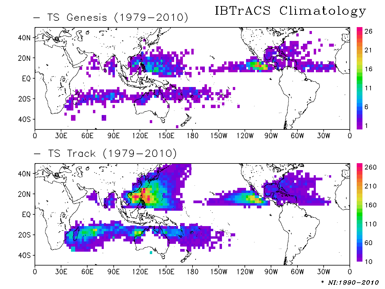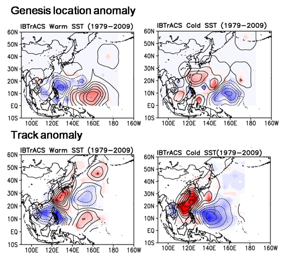 By the large-scale atmosphereic and oceanic changes, a warm sea surface temperature (SST) event (El Nino) and a cold SST event (La Nina) occur. These events affect genesis, track, and intensity of TS. The below figures show the differences of genesis and track between the warm and cold SST phase over the Western North Pacific.