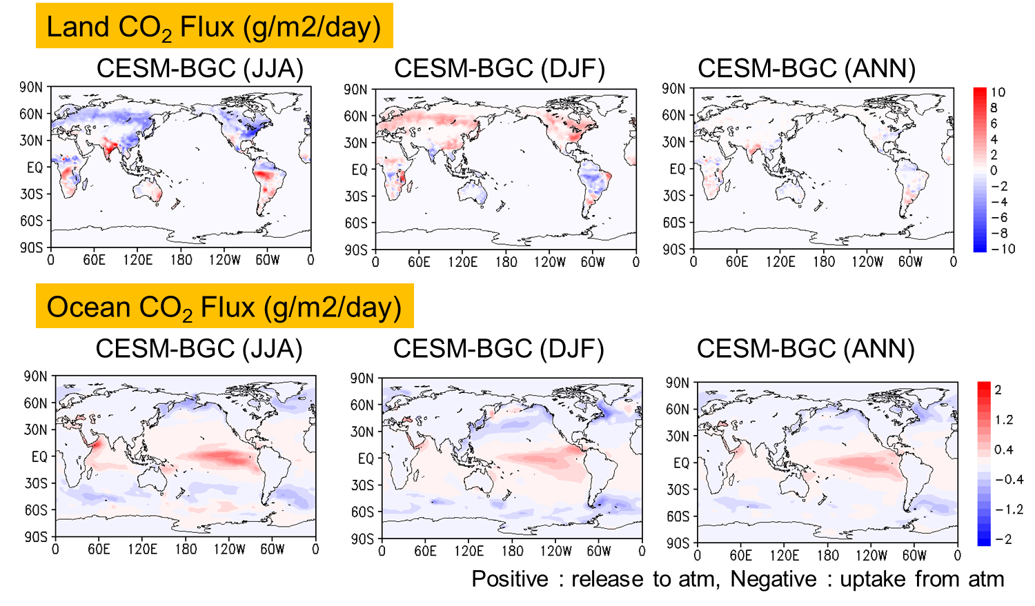 • -According to photosynthesis of plants, seasonal cycle of carbon dioxide flux over land changes. For instead, the terrestrial biosphere in Northern hemisphere is uptake carbon dioxide from atmosphere during boreal summer. In contrast, Amazon and the east part of Australia show negative carbon flux due to growth of plants.