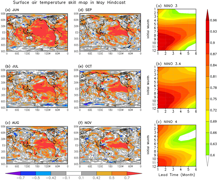 • <correlation skill map of surface air in May> <correlation between predicted and observed SST anomalies for Nino 3, Nino 3.4, Nino 4 regions>