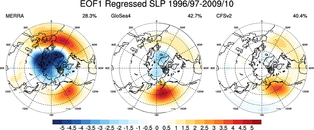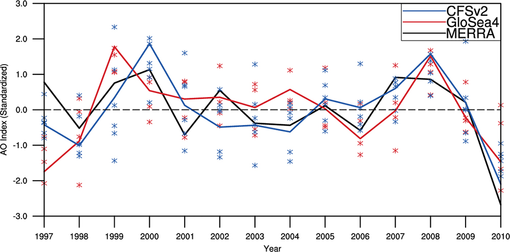 • In this research, AO prediction performances from two operational seasonal ensemble forecasting systems, UK Met Office Global Seasonal forecasting system version 4 (GloSea4) [Arribas et al., 2011] and The National Centers for Environmental Prediction (NCEP) coupled forecast system model version 2 (CFSv2) [Saha et al., 2012], are evaluated. AO predictability is marginally sensitive to initialization and time frequency of model. We examine the relationship to AO predictability from various initializations of the forecast systems.